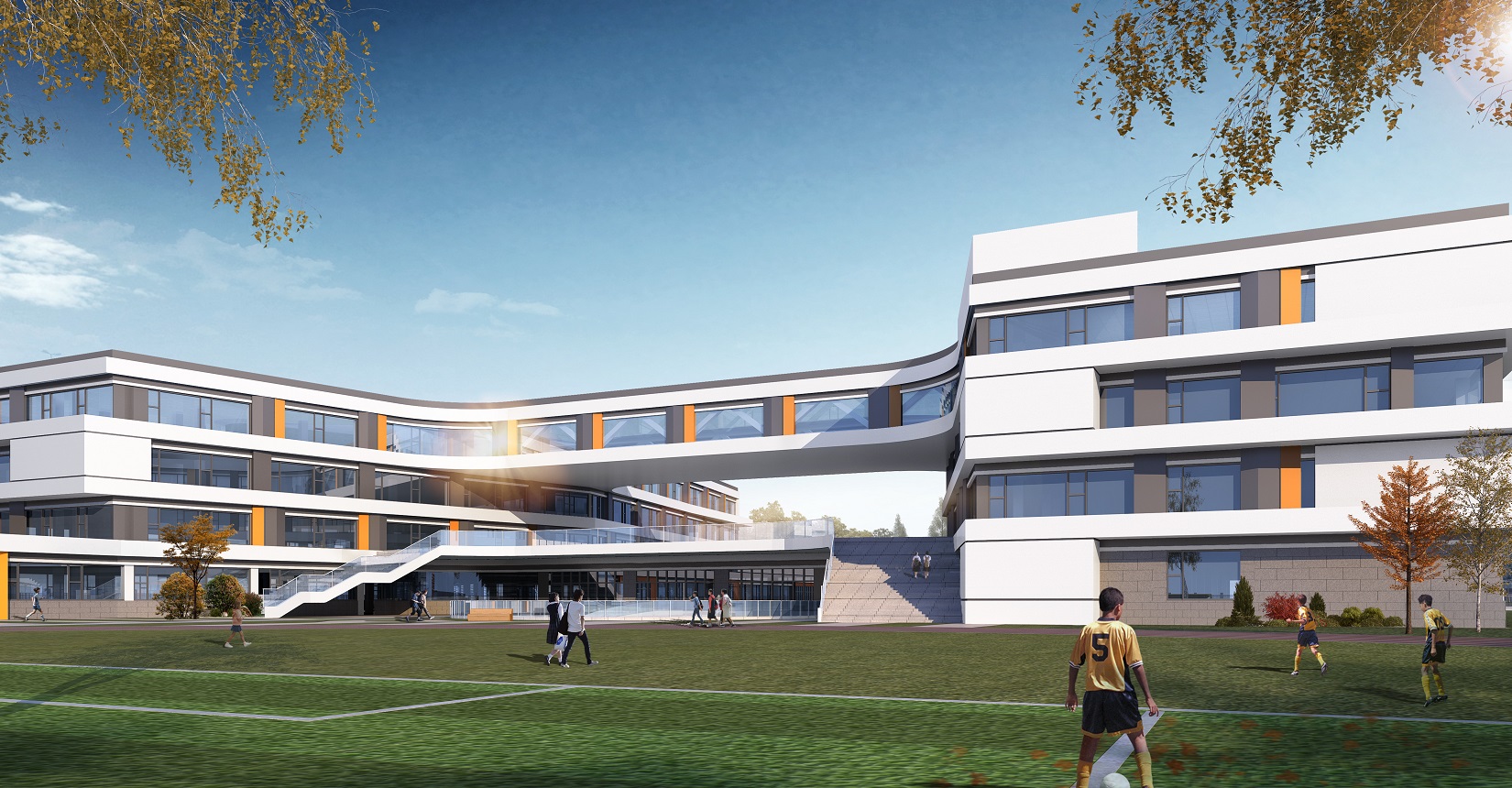 項目設計以“書籍”和“階梯”為靈感,將教學樓以退臺及錯落的形式展示“書籍”和“階梯”的理念,設計現代化“書本”校園,希望學生們在讀書中成長。